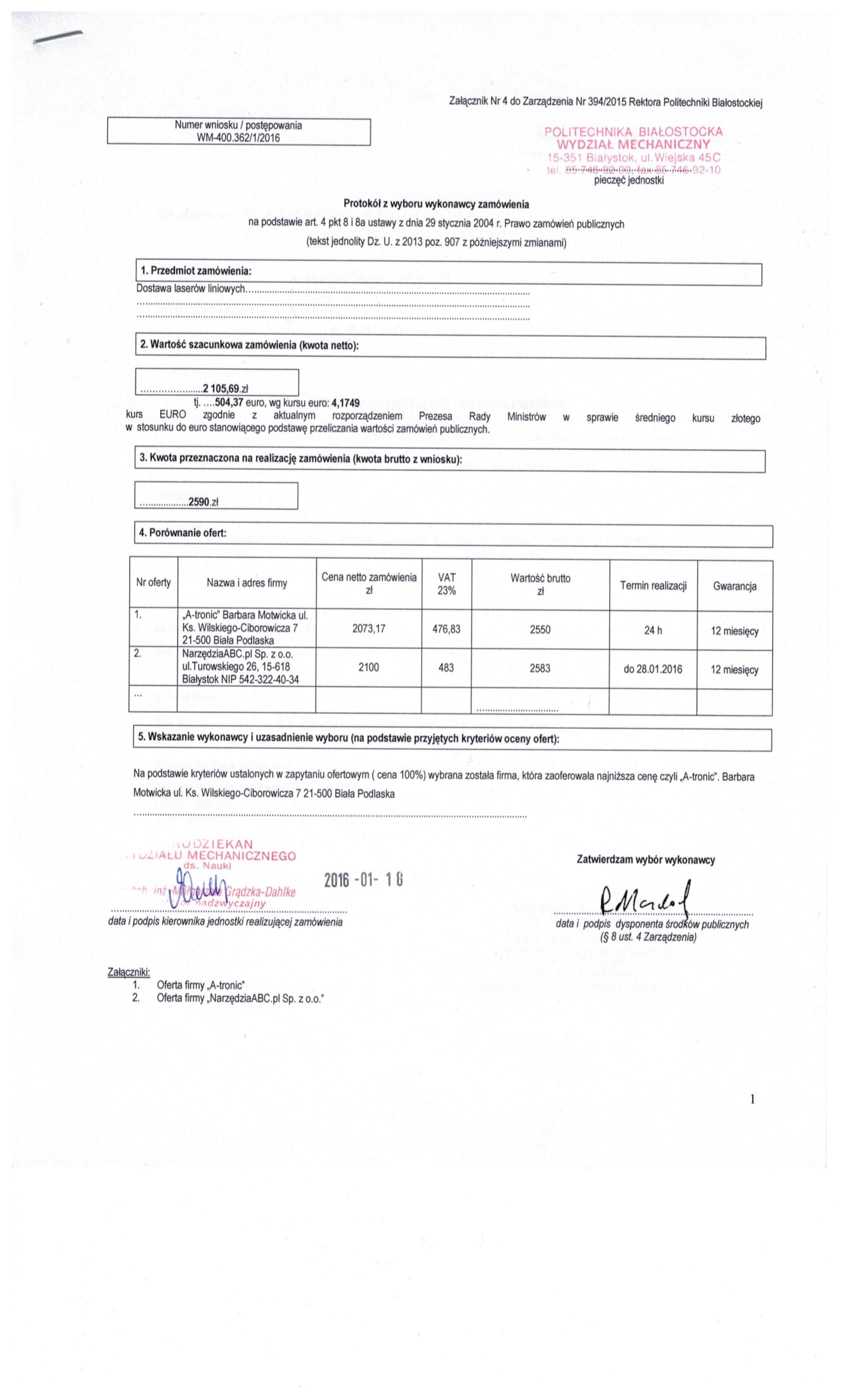 By a.wyszynska 11 / st. / 2016 Jednosta organizacyjna: Wydział MechanicznyZnak sprawy: WM-400.362/1/2016Przedmiot zamówienia: Dostawa laserów liniowych Ofertę należy złożyć do dnia: 2016-01-15Załączniki: WM_400_362_1_2016.pdf Załącznik nr 1 do zapytania ofertowego.docx Wybór najkorzystniejszej oferty Informacja o wyborze: WM_400_362_1_2016_protokol.jpg