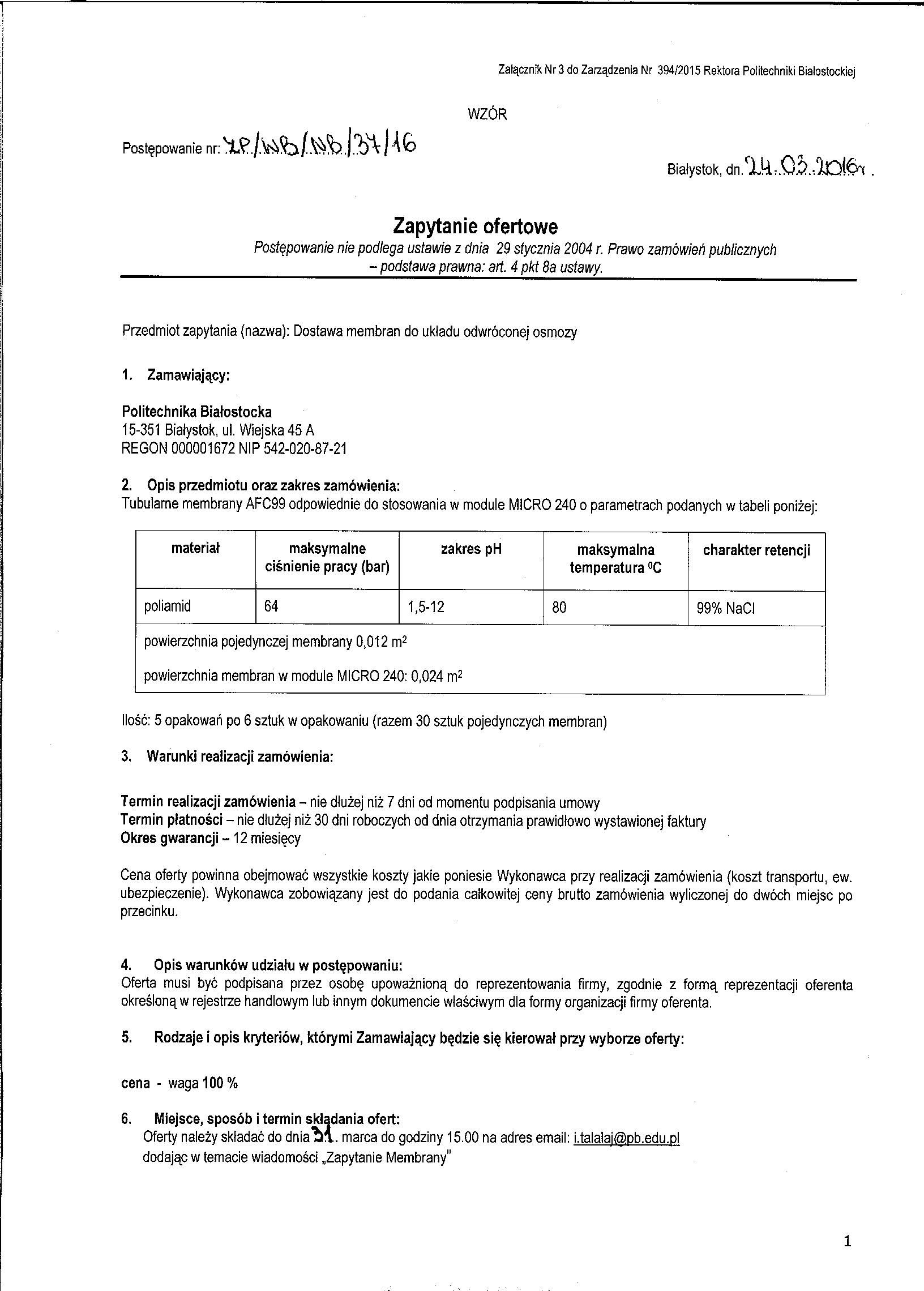 Zakup tubularnych membran AFC99
