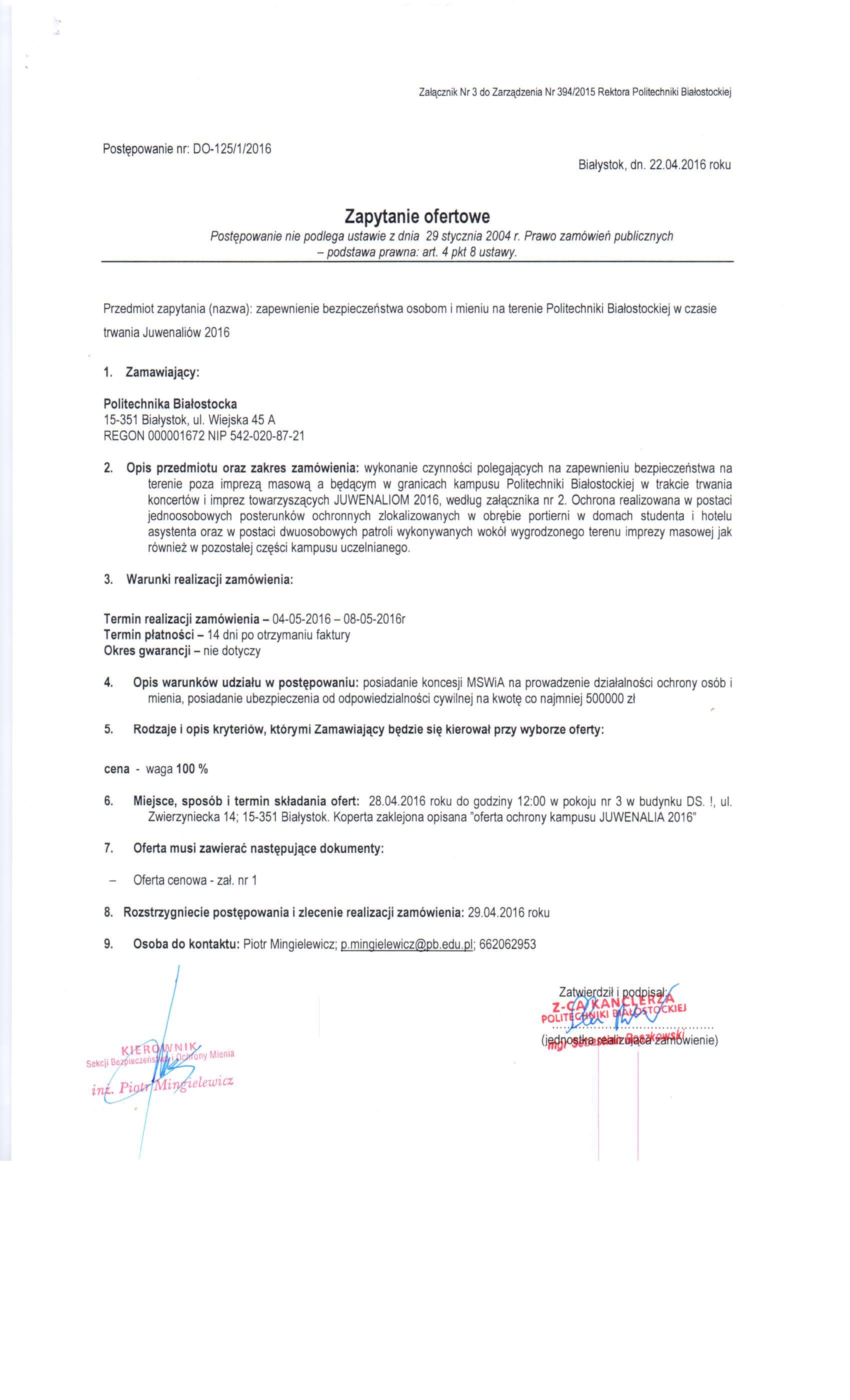 Zapewnienie bezpieczeństwa osobom i mieniu na terenie Politechniki Białostockiej w czasie trwania Juwenaliów 2016