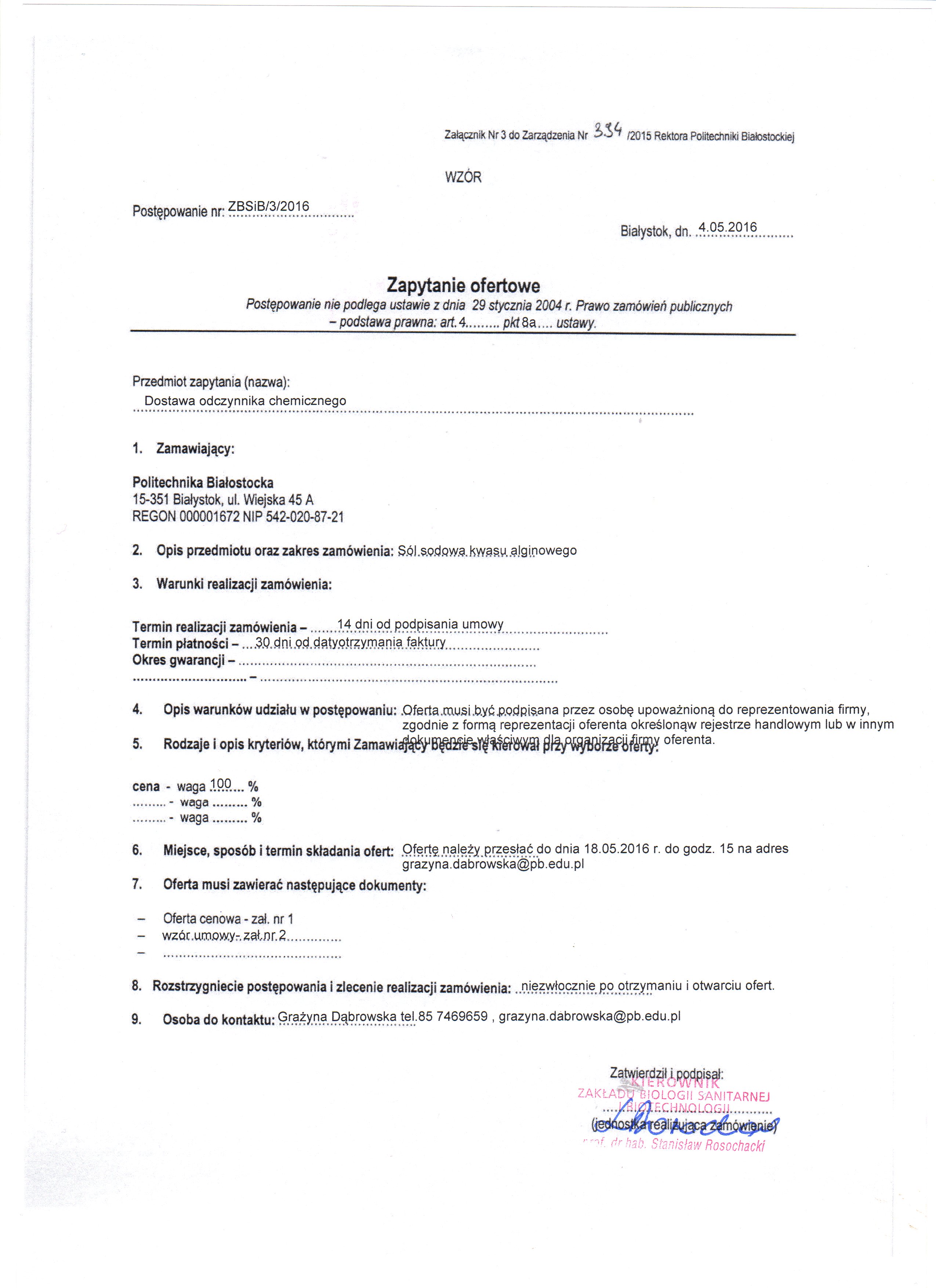 By a.wyszynska 11 / maj / 2016 Jednosta organizacyjna: Wydział Budownictwa i Inżynierii ŚrodowiskaZnak sprawy: ZBSiB/3/2016Przedmiot zamówienia: Dostawa odczynnika chemicznego Ofertę należy złożyć do dnia: 2016-05-18Załączniki: ZBSiB_3_2016.jpg Załącznik nr 1 do zapytania ofertowego.docx Wybór najkorzystniejszej oferty Informacja o wyborze: ZBSiB_3_2016_protokol.jpg