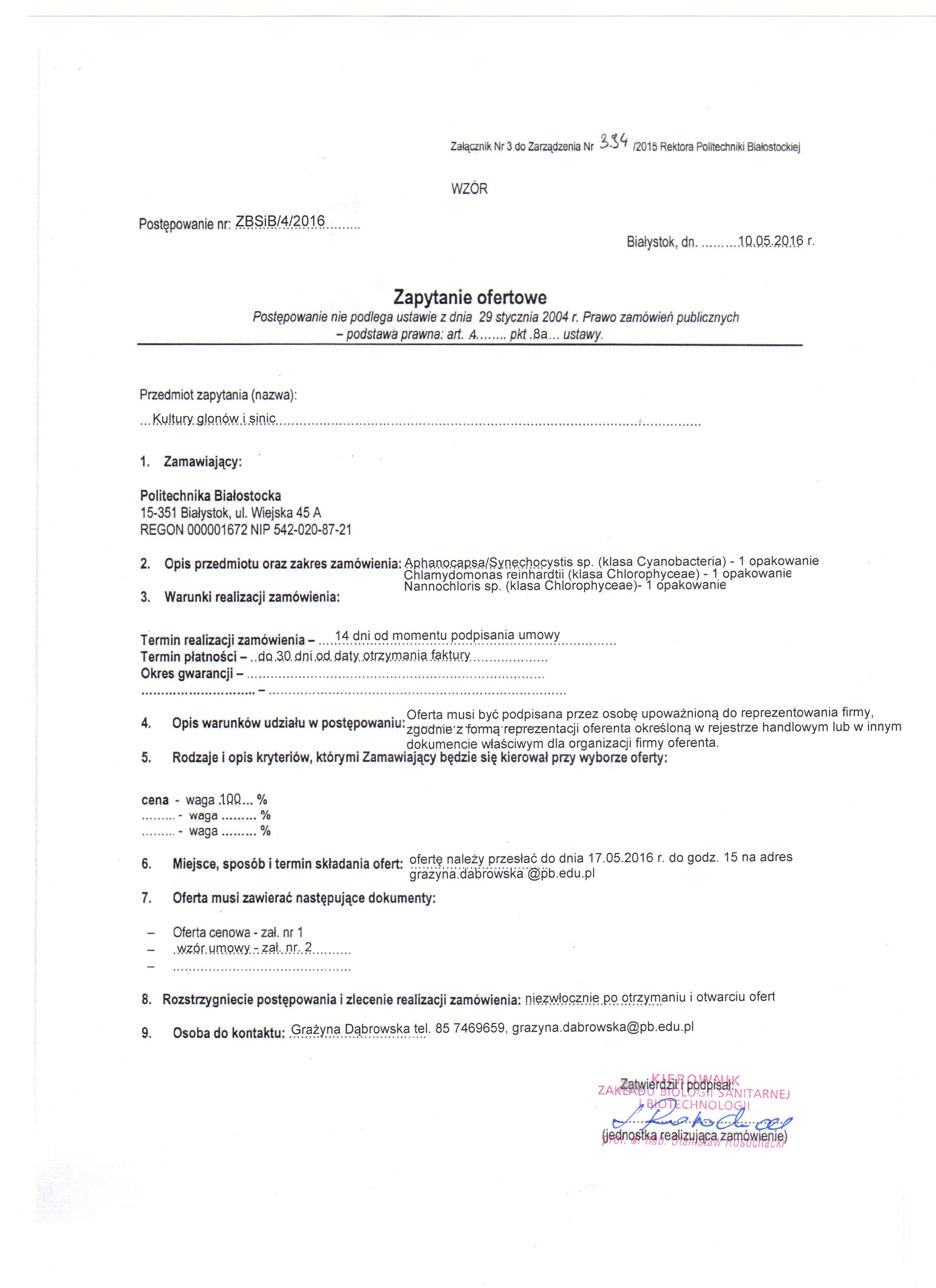 By a.wyszynska 11 / maj / 2016 Jednosta organizacyjna: Wydział Budownictwa i Inżynierii ŚrodowiskaZnak sprawy: ZBSiB/4/2016Przedmiot zamówienia: Kultury glonów i sinic Ofertę należy złożyć do dnia: 2016-05-17Załączniki: ZBSiB_4_2016.jpg Załącznik nr 1 do zapytania ofertowego.docx Wybór najkorzystniejszej oferty Informacja o wyborze: ZBSiB_4_2016_informacja.jpg