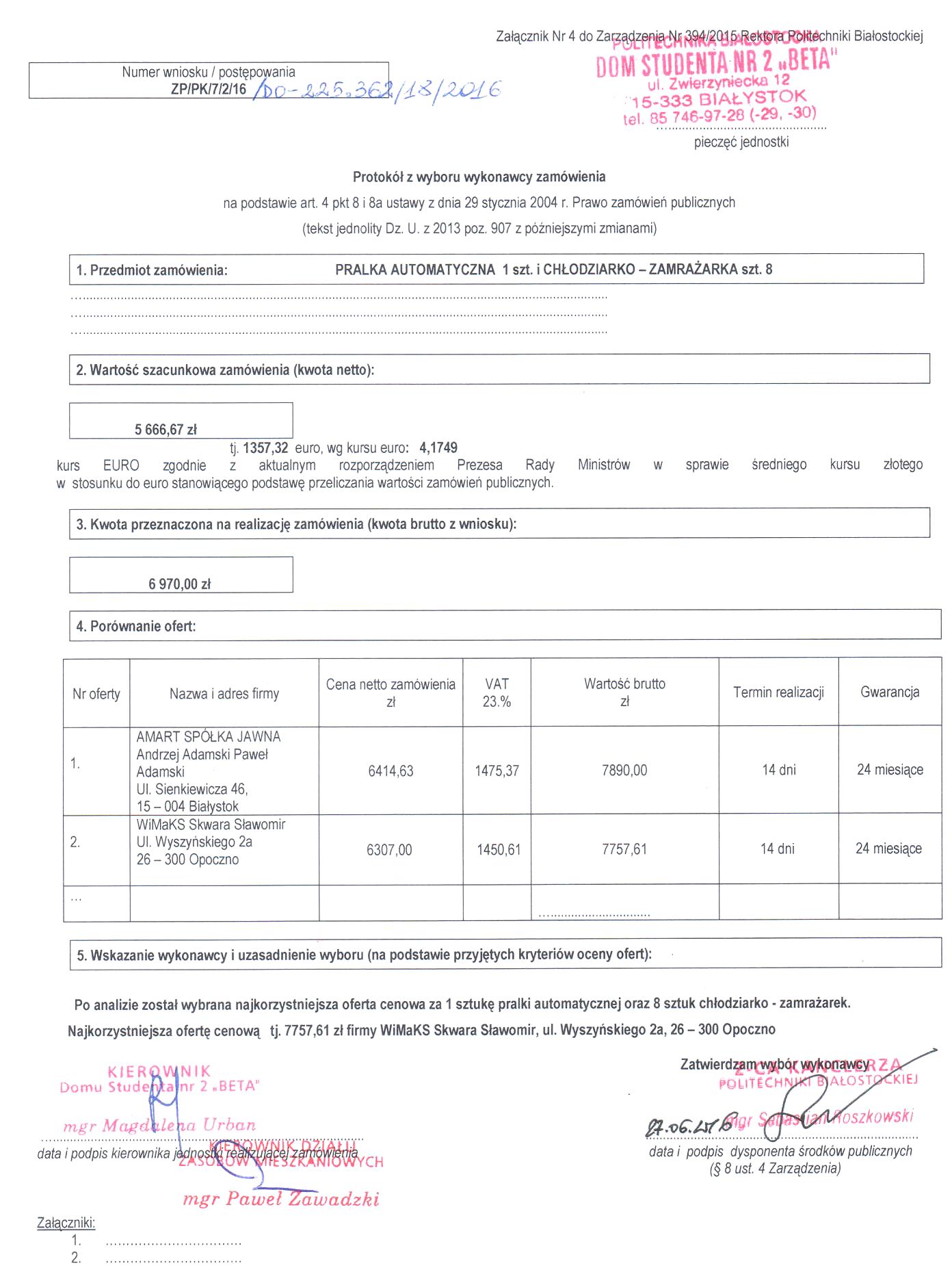 Dostawa sprzętu AGD (pralki – szt.1 i chłodziarko – zamrażarki – szt. 8) na potrzeby Domu Studenta nr 2 Politechniki Białostockiej |