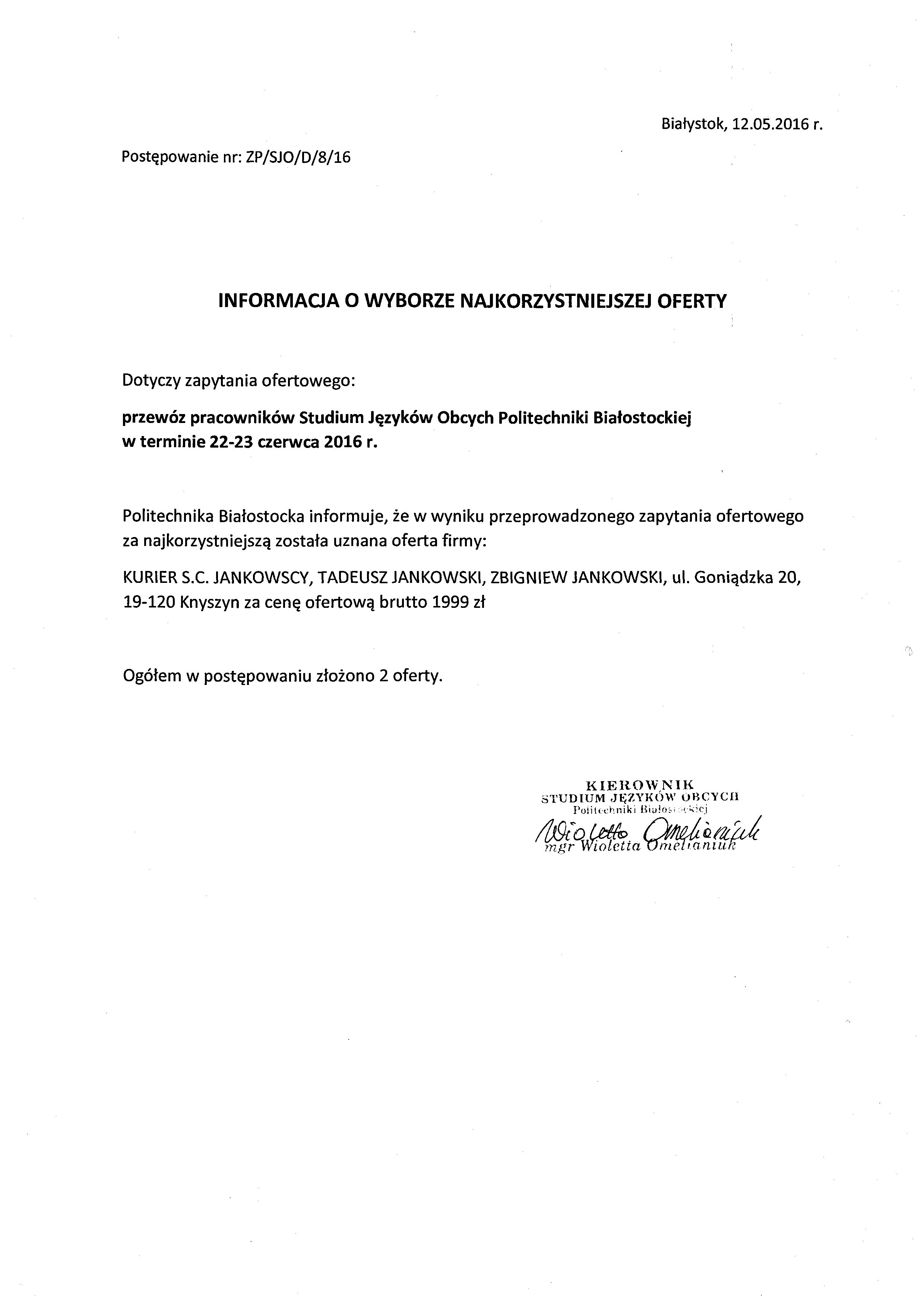 | Zapytanie numer ZP/SJO/D/8/16 |